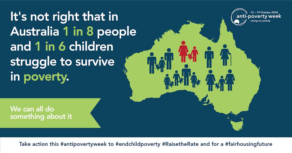 Image: Graphic tile with a blue background and a green map of Australia with icons of people in blue and red. Text: It's not right that in Australia 1 in 8 people and 1 in 6 children struggle to survive in poverty. We can all do something about it.