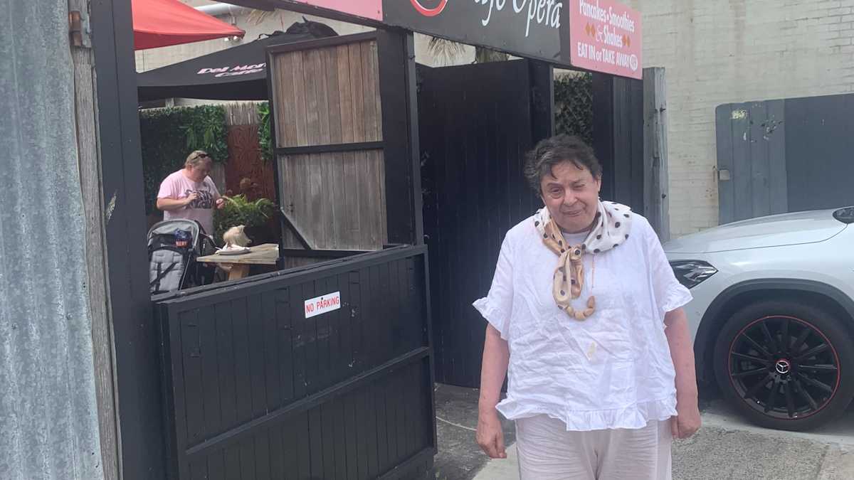 Image: Katina stands outside of a restaurant, looking at the camera.