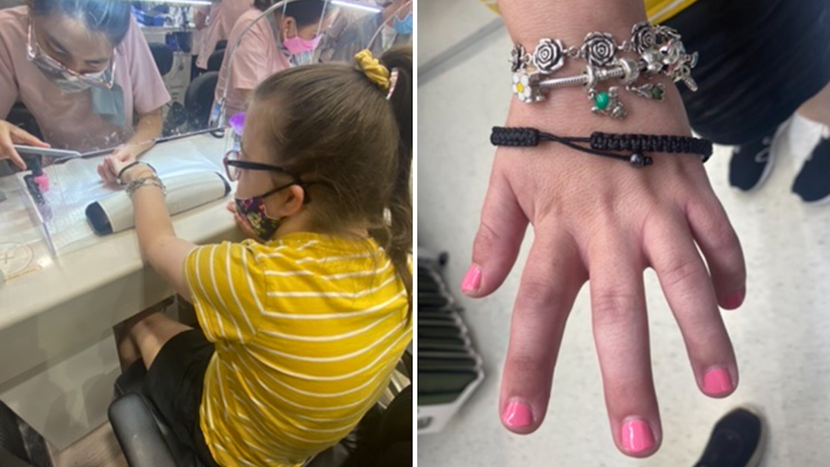 Image: Collage of images: 1. Olivia sitting in a nail salon. 2.Close-up of Olivia's nails, which are painted pink.