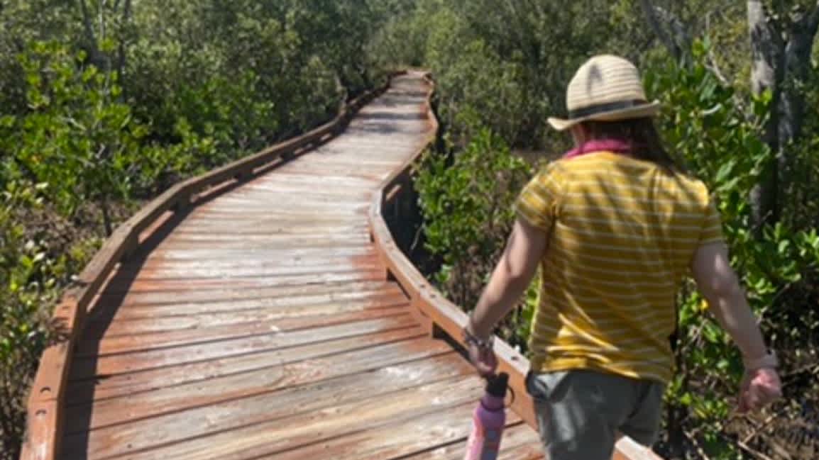 Image: Olivia wearing a hat and a striped yellow top walking on a boardwalk.