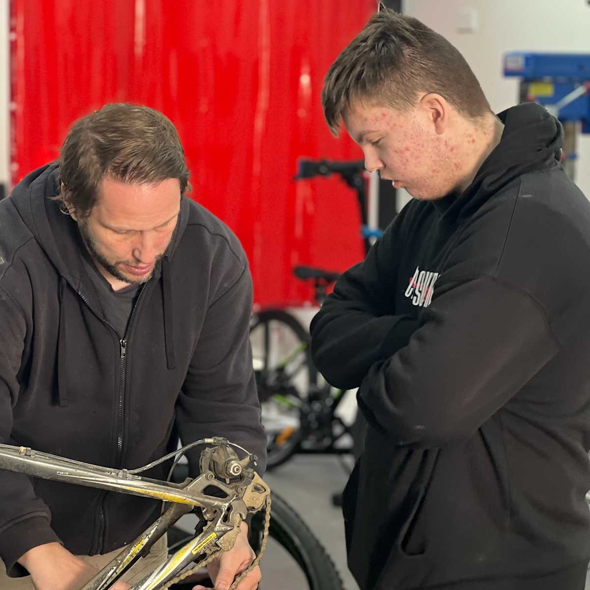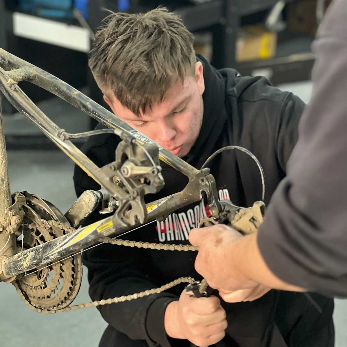 Image: Quinn completing repairs on a bike.