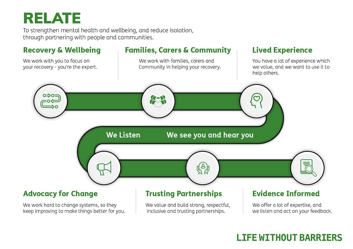 RELATE is the Life Without Barriers' Mental Health Framework, it guides how we approach the planning and delivery of Mental Health services nationally. It was co-designed by Life Without Barriers along with consumers, families and carers. It ensures that all our services are recovery-focused, culturally safe, inclusive, and grounded in lived experience.