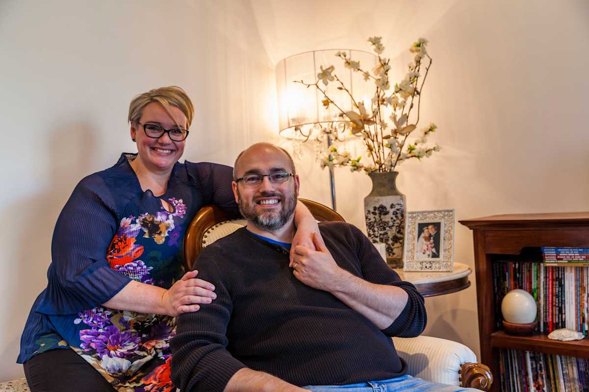 Image: Mature foster carer couple sitting in their lounge room smiling