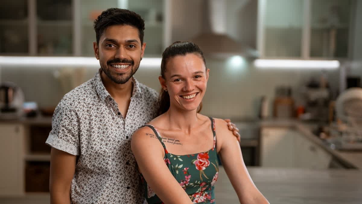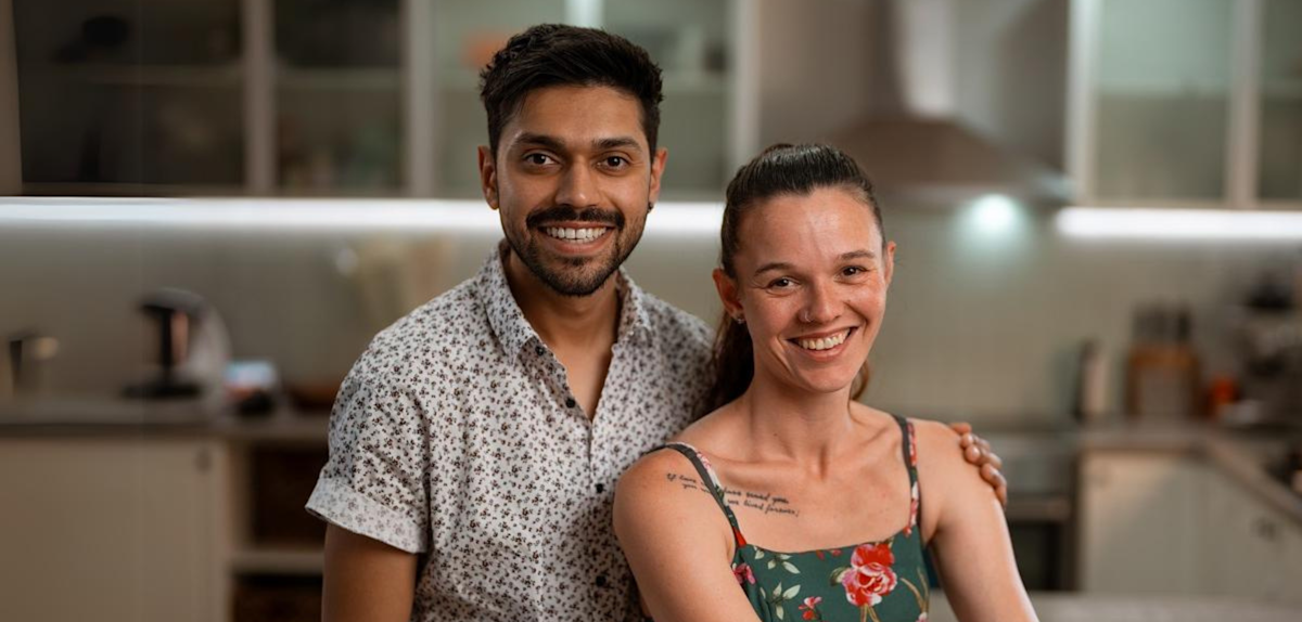 Image: Shailen and Tahnee stand together in a kitchen, smiling at the camera.