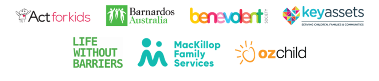 Image: Logos of the organisations which make up for the Allies for Children: Life Without Barriers, Act for Kids, OzChild, Mackillop Family Services, Key Assets, Barnardos Australia, The Benevolent Society.