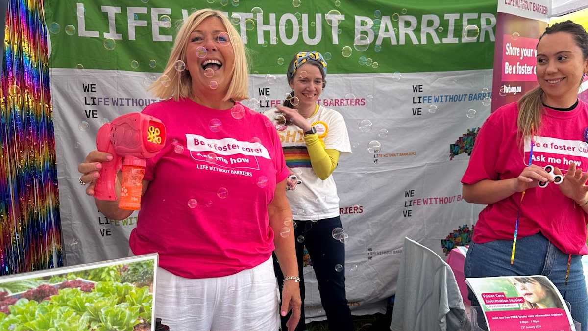 At the booth, we had friendly Life Without Barriers carer community staff and foster care ambassadors! They chatted with attendees about foster care, gave out some fun pink merch, and encouraged festival goers to leave a message for LGBTQIA+ children and young people in care on a large flag!