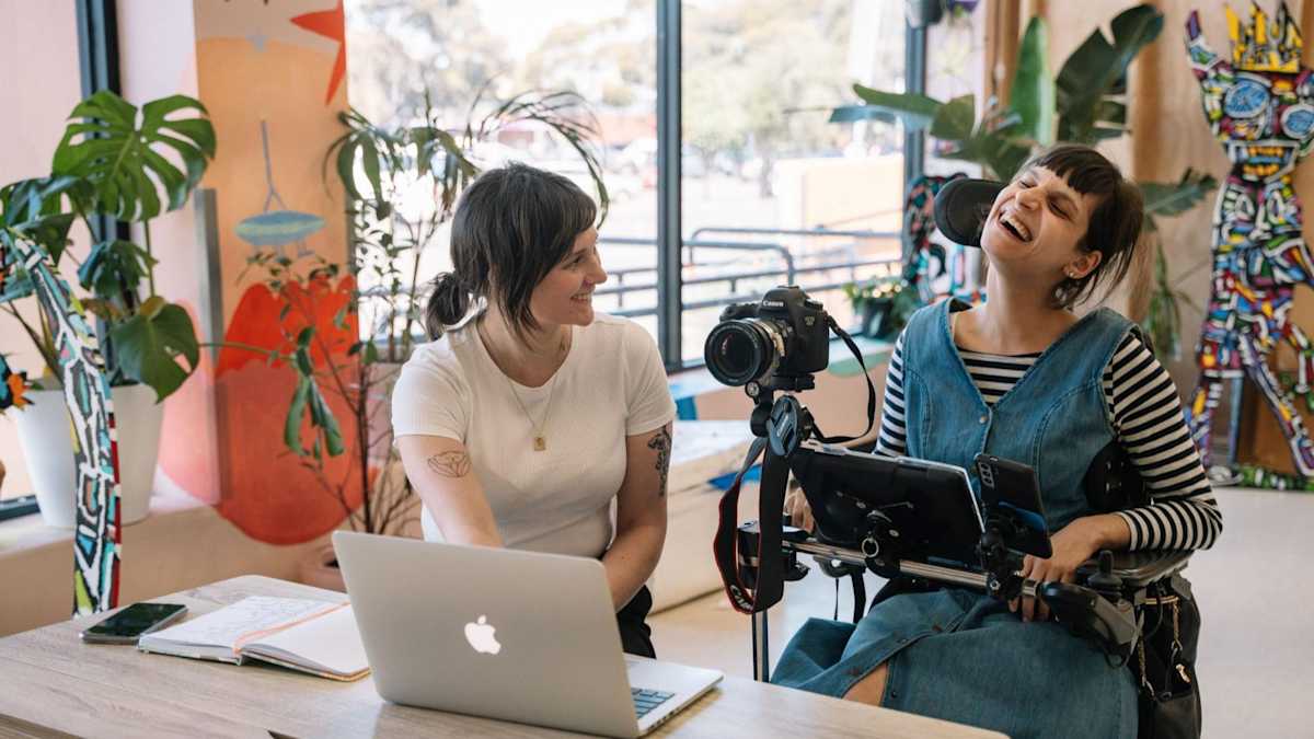 Image: Hannah and Nic sitting in the Loom studio working at a laptop / Image credit: Phoebe Powell