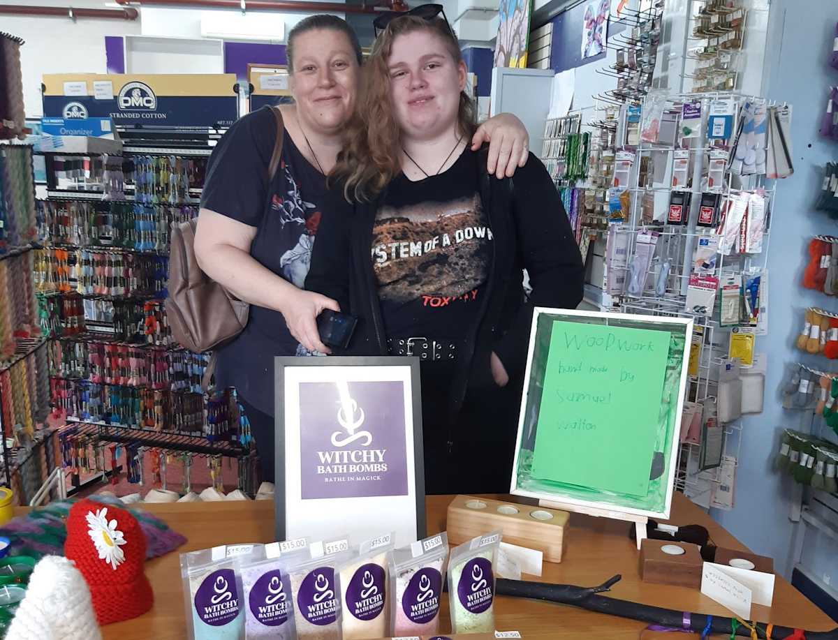 Image: Lesley and Georgia stand behind a table with Witchy Bath Bomb merchandise in a store.