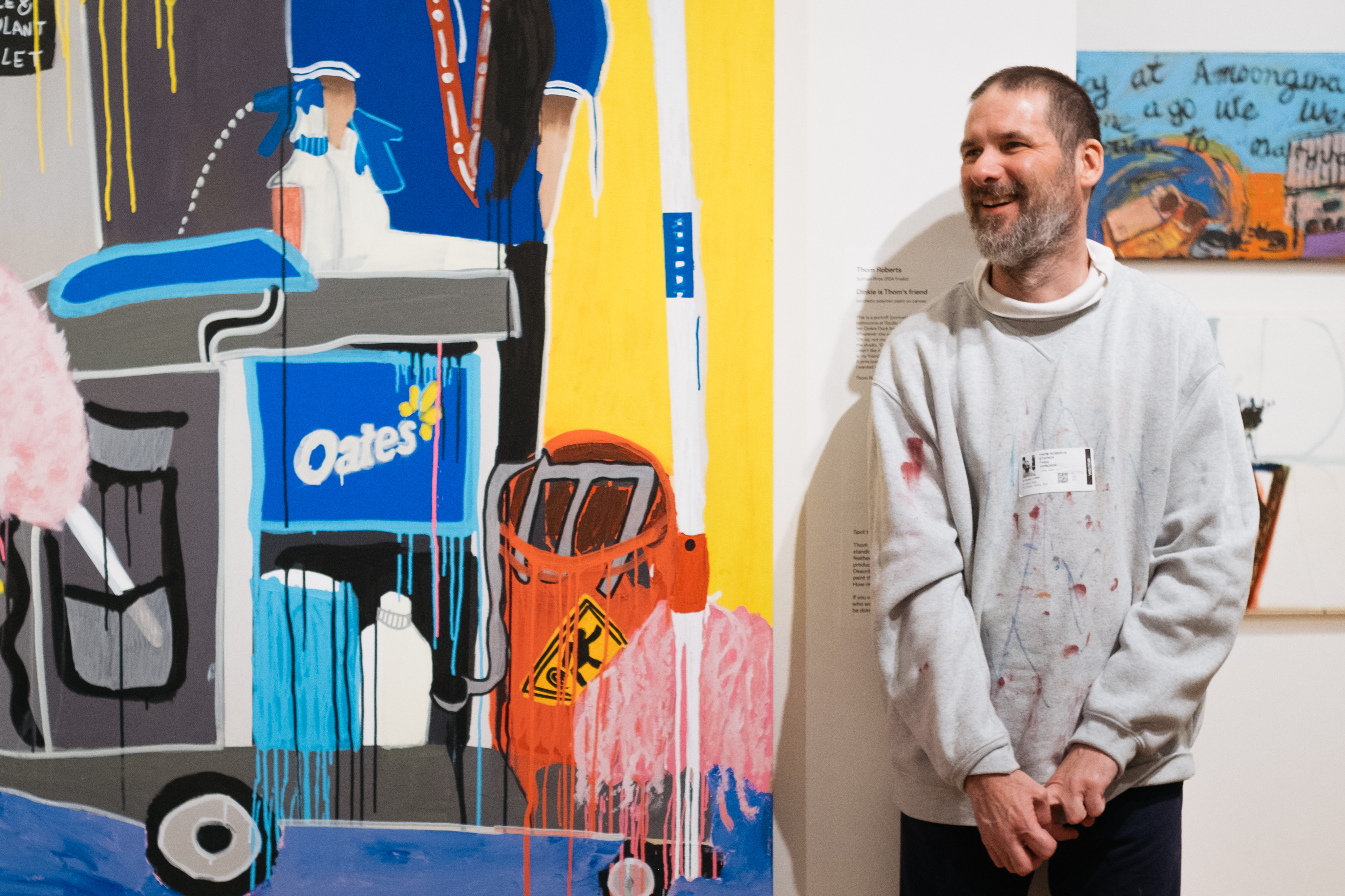 Image: Thom Roberts stands with one of his art pieces, a finalist in the Archibald and the Sulman prizes at AGNSW. Credit: ABC Arts: Eloise Fuss