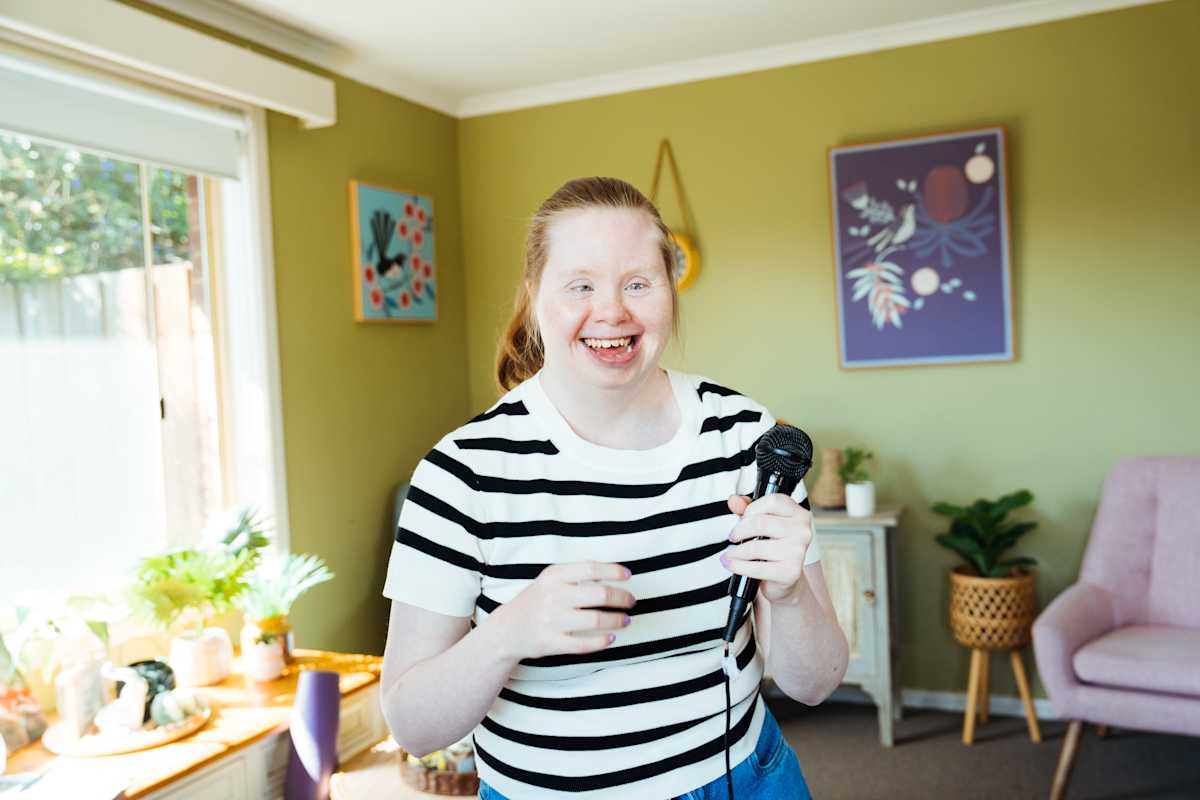 Image: Sam singing karaoke. She is wearing a striped shirt.