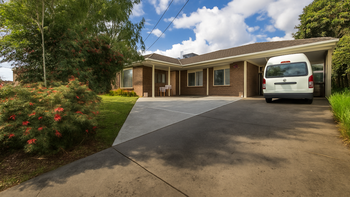 Image: Single-storey brick home with driveway, garden with trees, and white van parked under carport.