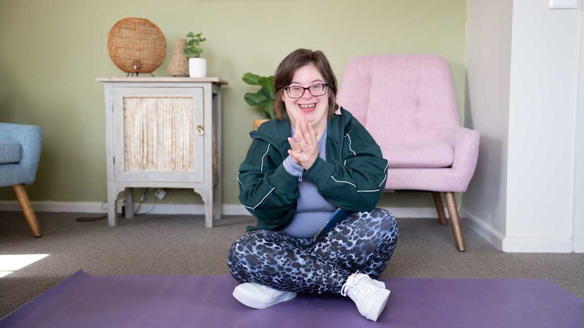 Image: Kristie is sitting on a yoga mat and smiling at the camera.