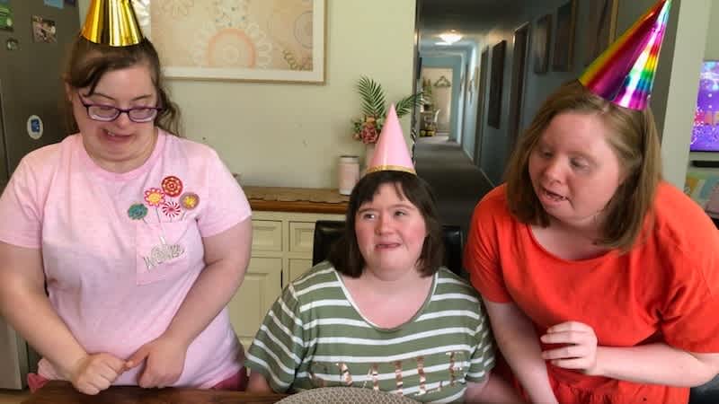 Image: Kristie, Livvy and Sam are wearing party hats and at a table with a strawberry birthday cake on it.