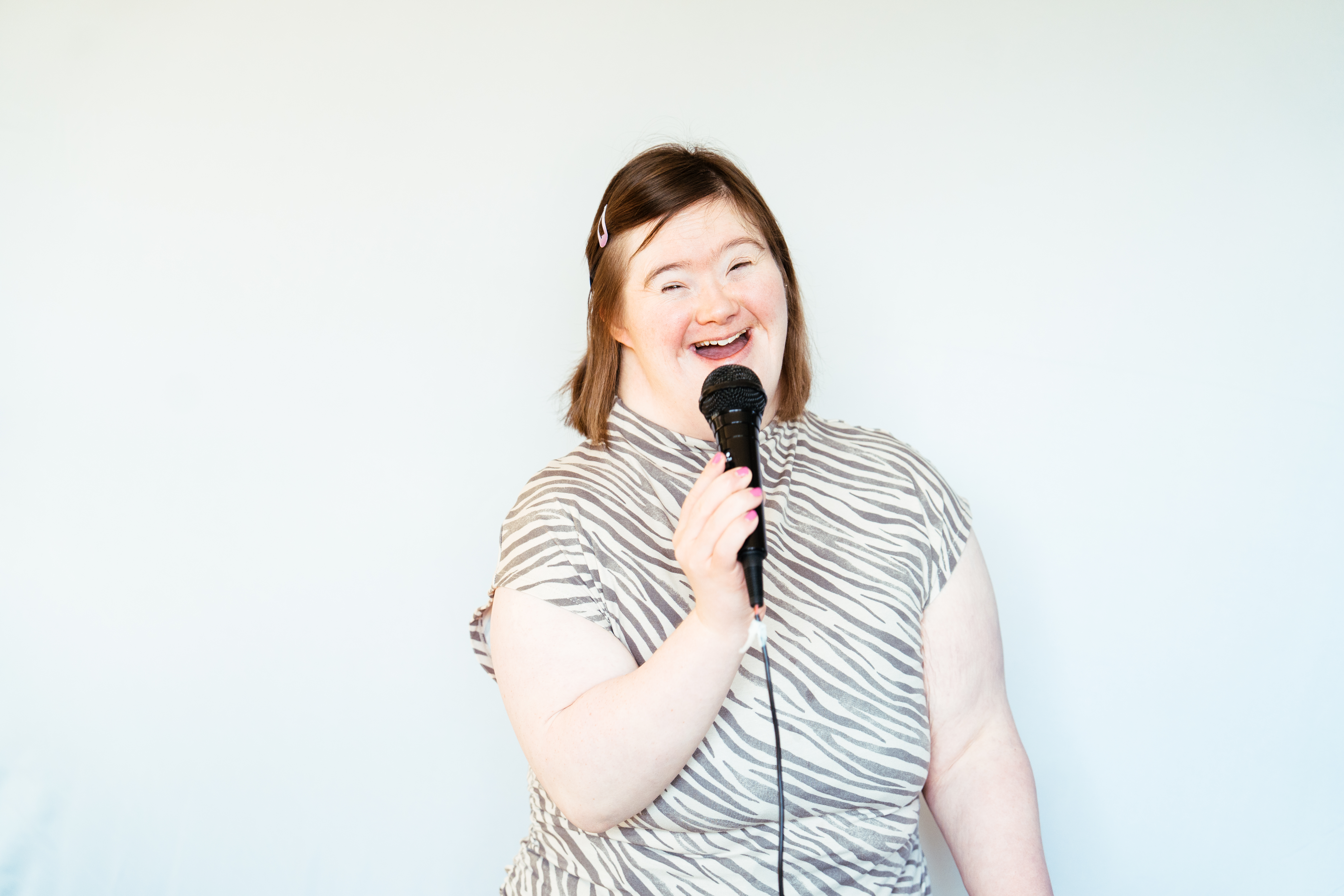 Image: Sam singing karaoke. She is wearing a striped shirt.
