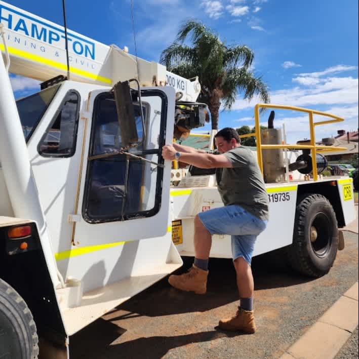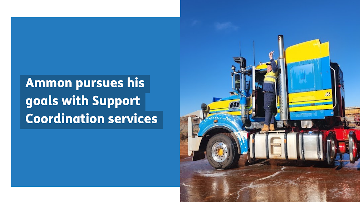 Image: Ammon stands on the side of a truck, smiling and waving. Text: Ammon pursues his goals with Support Coordination services.