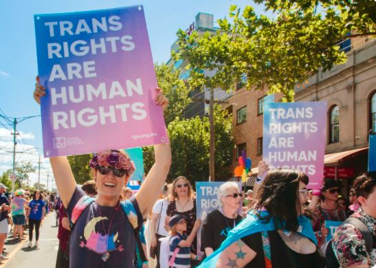 Image: Trans rights march. There is a person holding a sign that says 'Trans rights are human rights'.