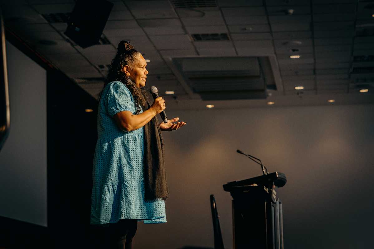 Image: Aunty Brenda Matthews on stage speaking into a microphone. She is wearing a blue dress and dark scarf.