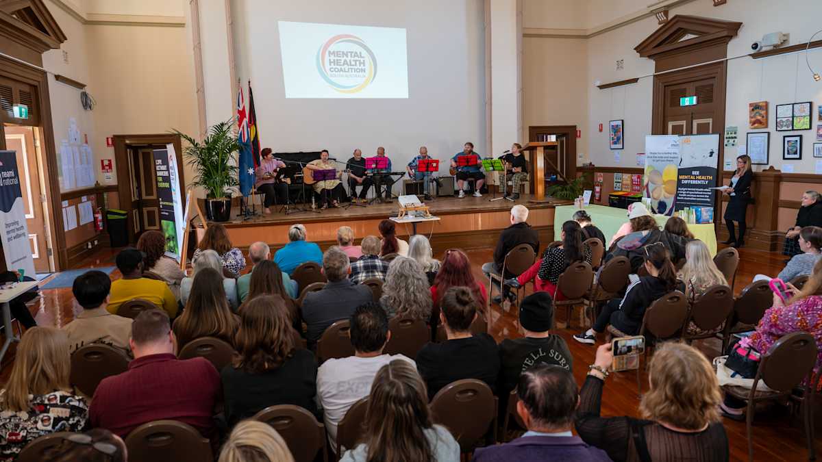 Image: An audience sits in front of a group of musicians performing on the stage at the 2025 mindshare Exhibition Launch. Photo credit: Naomi Jellicoe Photography.