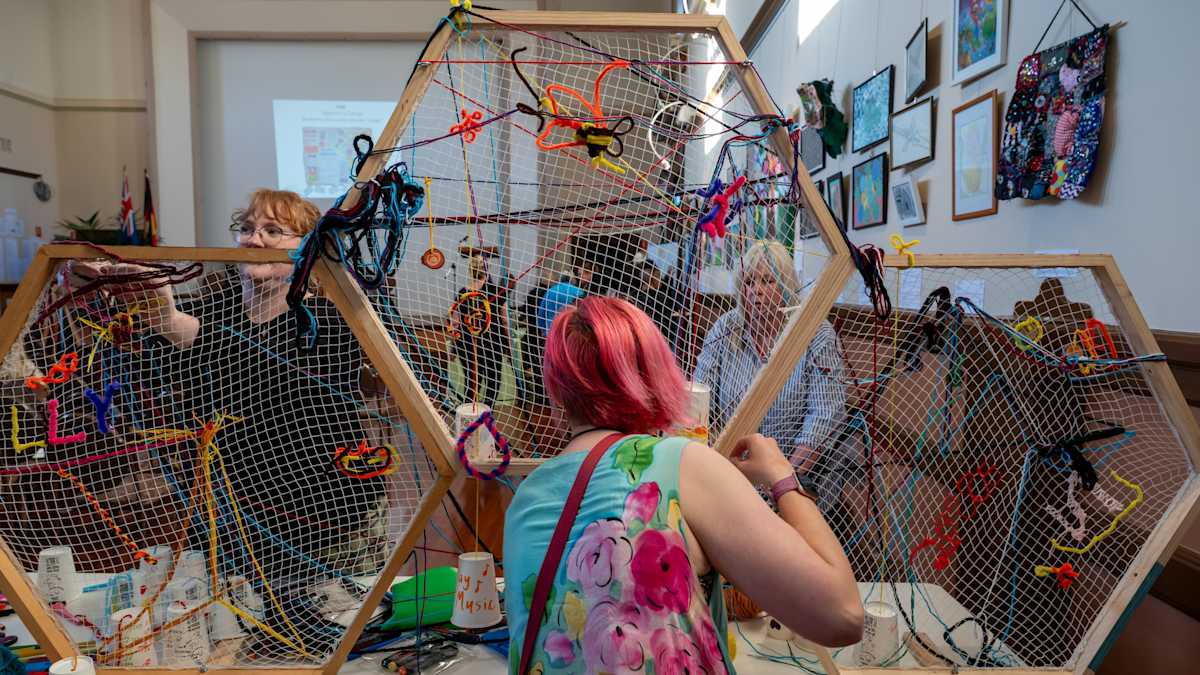 Image: Attendees adding to the large woollen web, part of the collaborative community artwork. Photo credit: Naomi Jellicoe Photography.