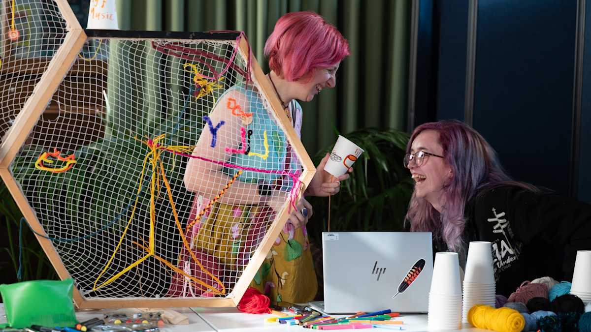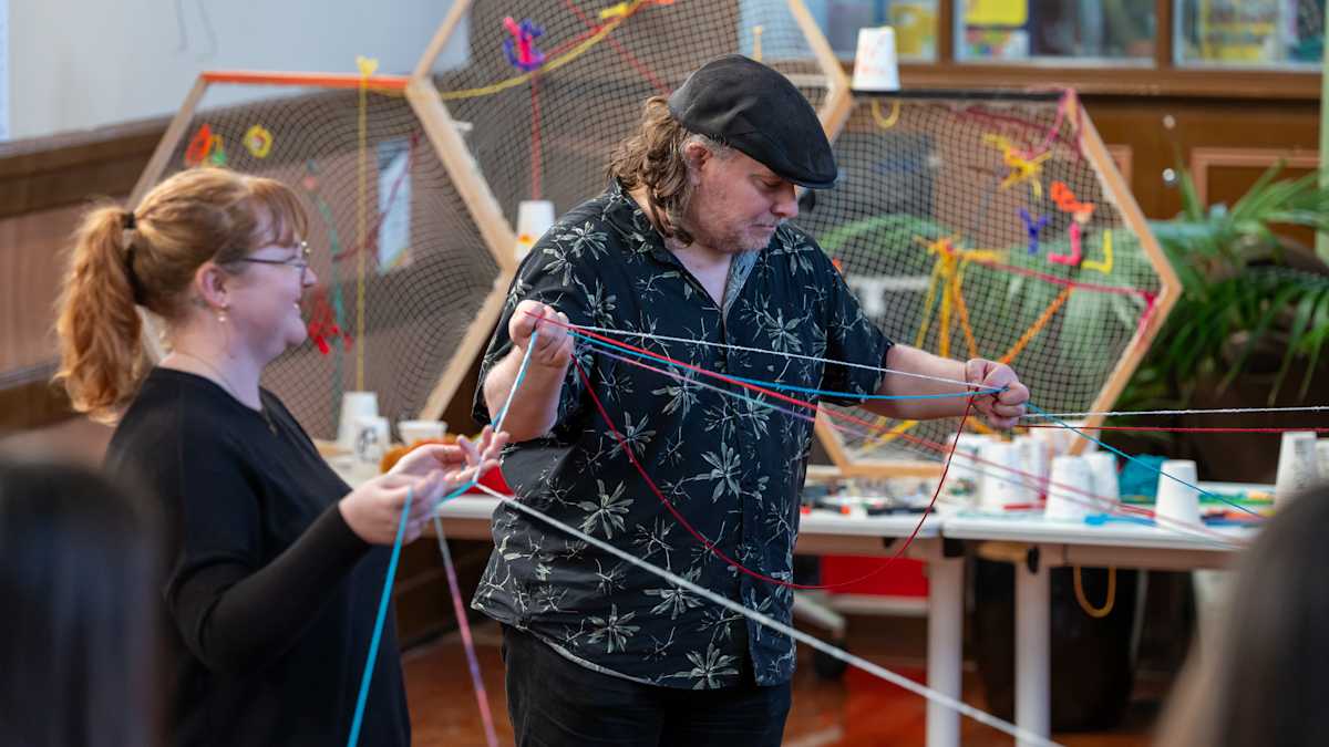 Image: Two attendees holding multiple strings of wool, taking part in the collaborative community artwork. Photo credit: Naomi Jellicoe Photography.