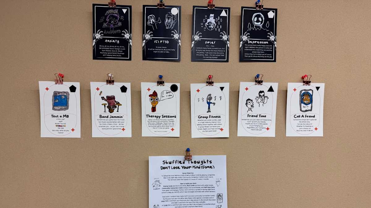"'Shuffled Thoughts – Don’t Lose Your Mind' is a card game I’m designing to start conversations about how we support ourselves and each other during tough times. There are boss cards like ‘Depression’ and ‘Grief’, but also ‘Self-Care’ and ‘Community Connection’ cards to help you win, one round at a time."