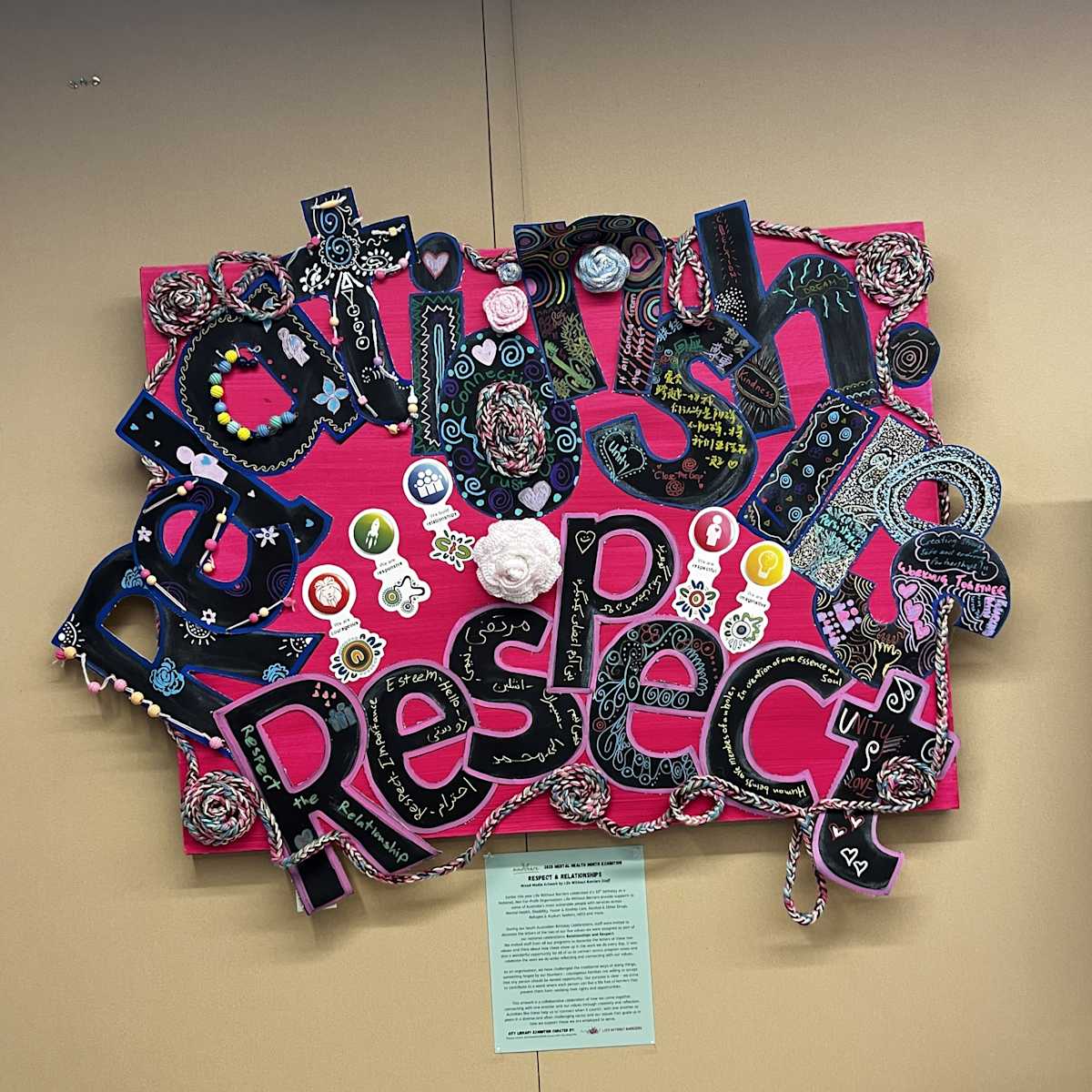 One such piece, 'Respect and Relationships,' was created by staff during Life Without Barriers' 30th Anniversary celebrations at Walyu Tutu, Life Without Barriers Unley Office. Staff were invited to decorate letters from the words 'Respect' and 'Relationships', two of our values assigned to our National Immigration Support Services (NISS) team and South Australia respectively, while reflecting on how these values show up in their daily work.