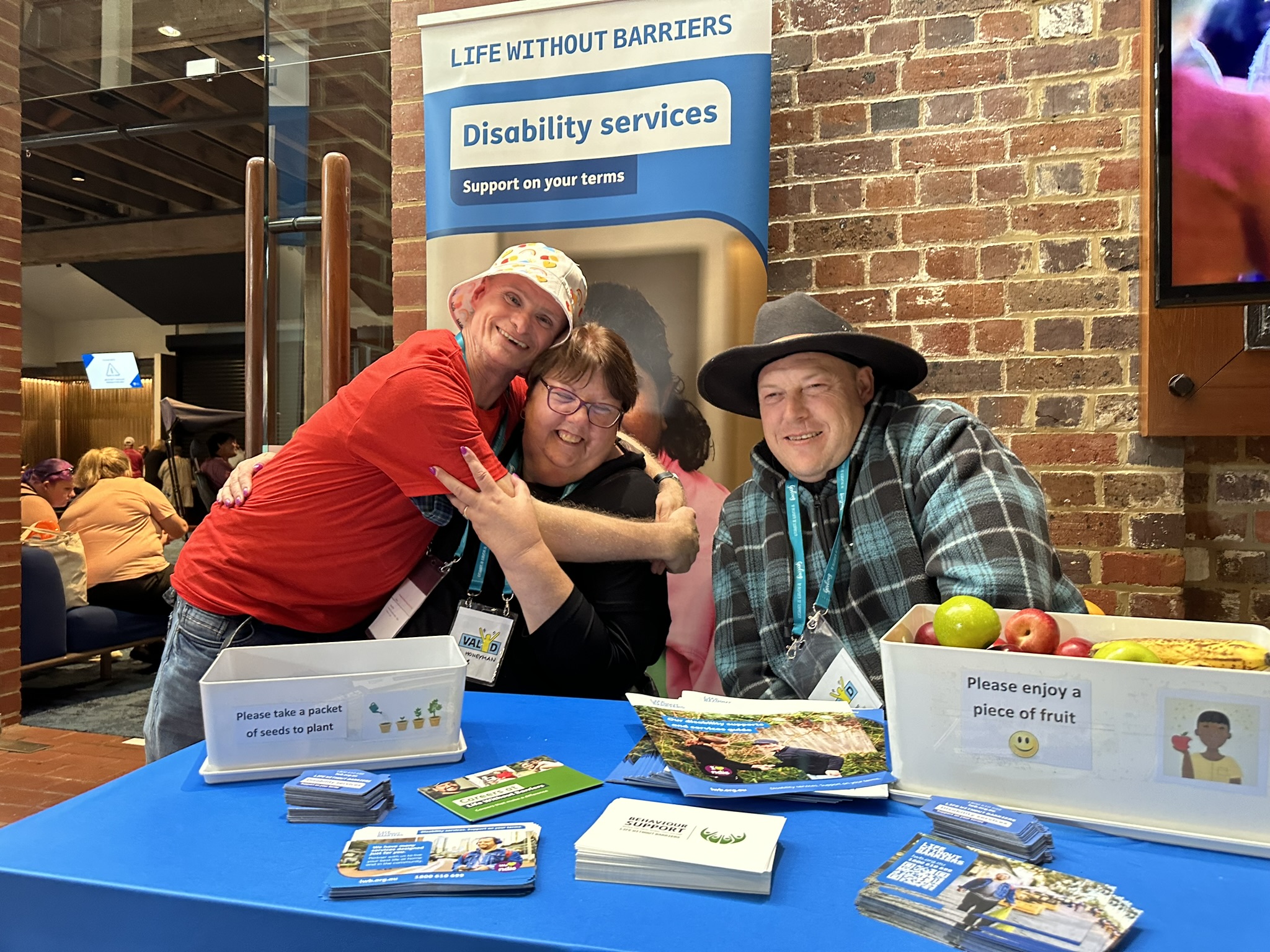 Image: Debra, Regional Director VDAS North East, and Dennis sit at the Life Without Barriers' booth at the 2024 Having a Say conference.