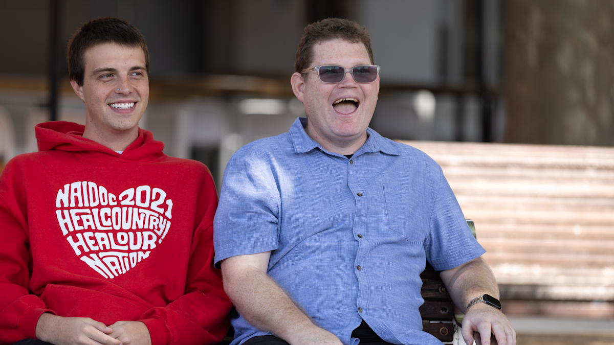 Image: A support worker and a participant sit together on a bench.