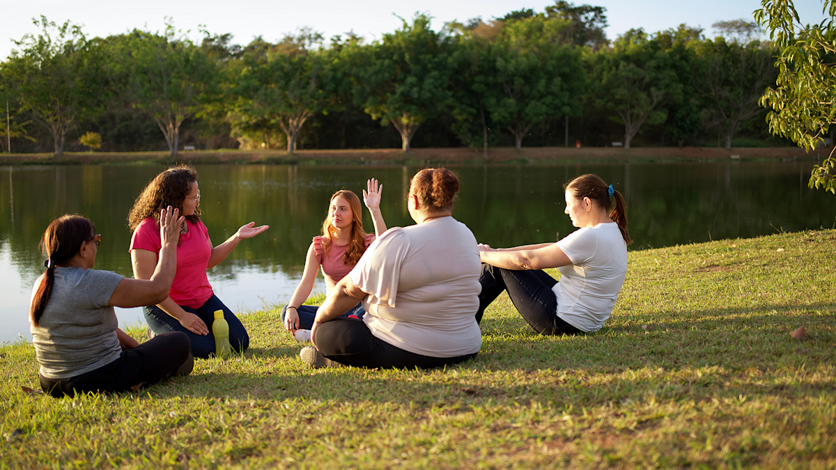 Image: Five women sit in a circle. They are outside on the grass, there is a lake and trees behind them.