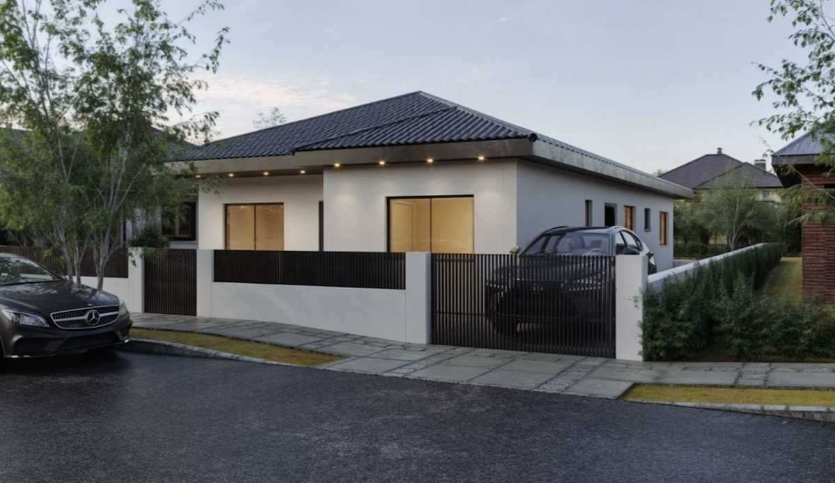Image: Modern single-storey house with a dark tiled roof and white exterior walls, viewed from the street at dusk.
