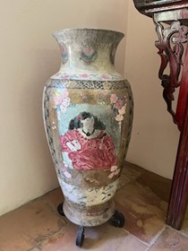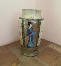 Image: A large ceramic pot with a painting of a woman in a blue robe that was created by Meredith sits on the floor.
