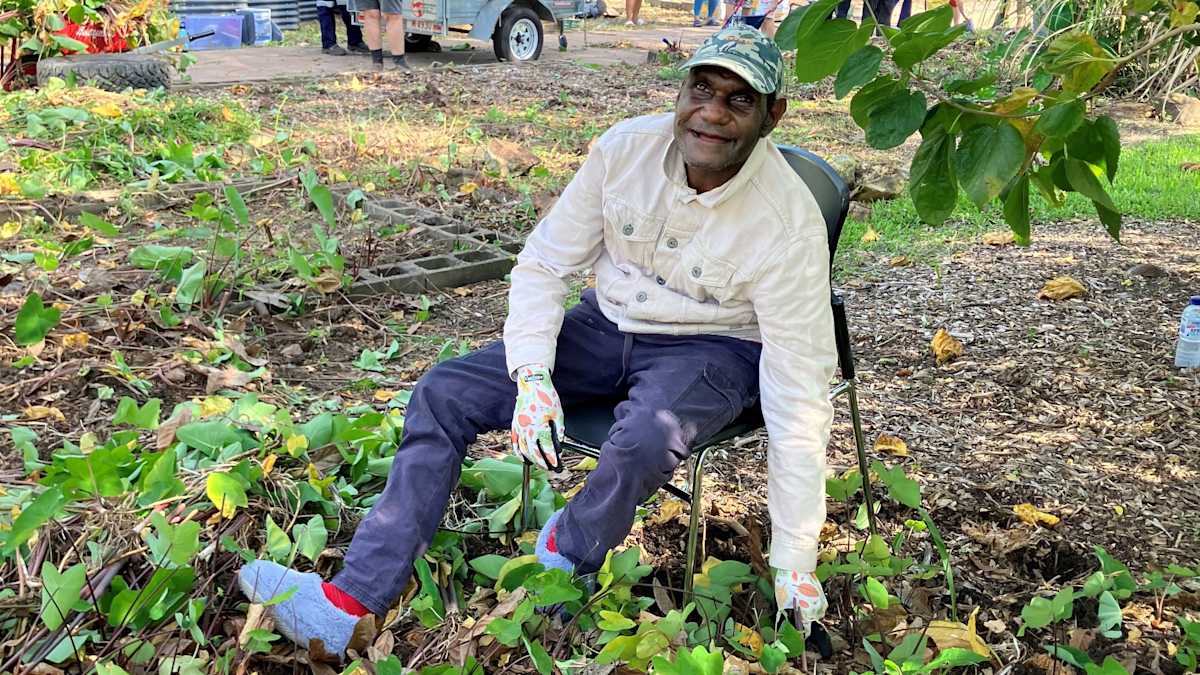 Image: Warren sitting on a chair, cleaning up the Harvest Corner garden.