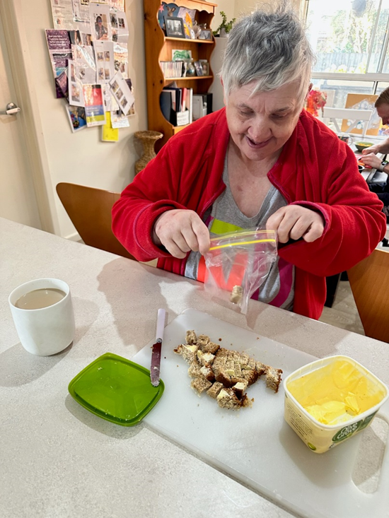 Image: Lorraine is buttering bread in the kitchen.