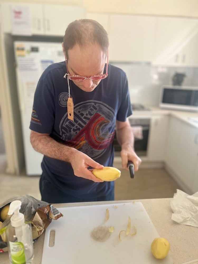Image: Craig peeling potatoes while standing at a kitchen bench.