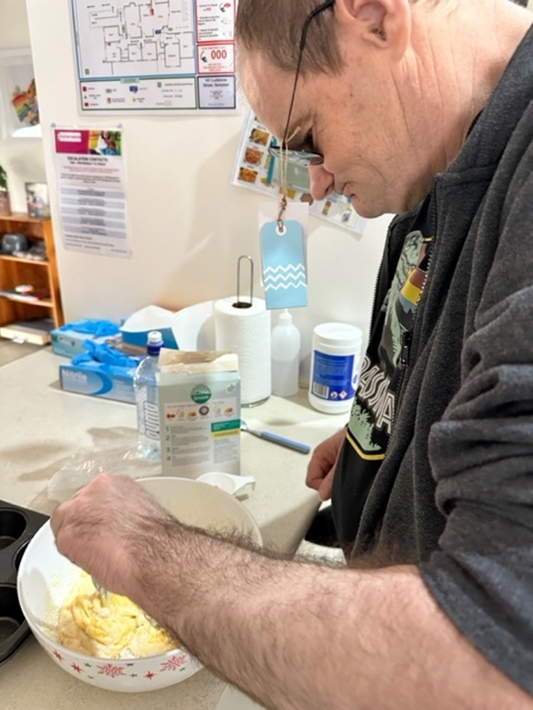 Image: Craig mixing cake ingredients in a bowl while standing at a kitchen bench.