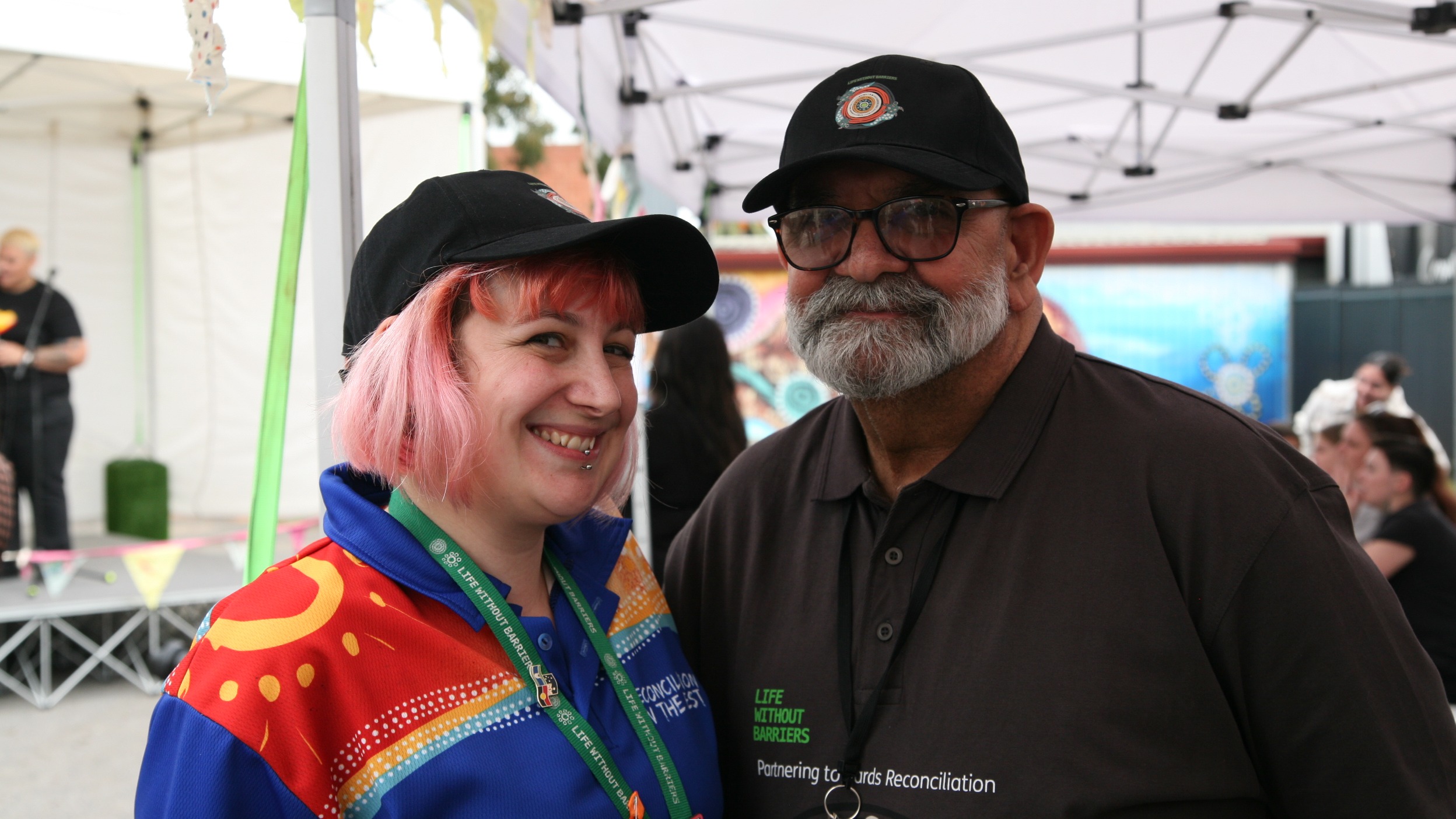 Image: Close up of two Life Without Barriers staff members at the 2023 Reconciliation in the West event.