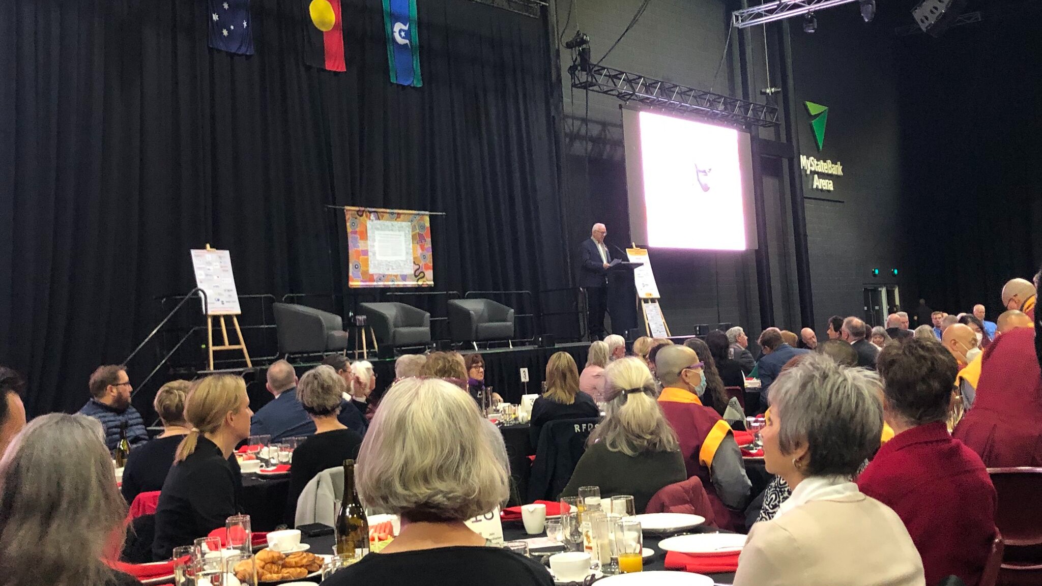 Image: Attendees listening to a man present on stage at the Reconciliation Week breakfast in Hobart.