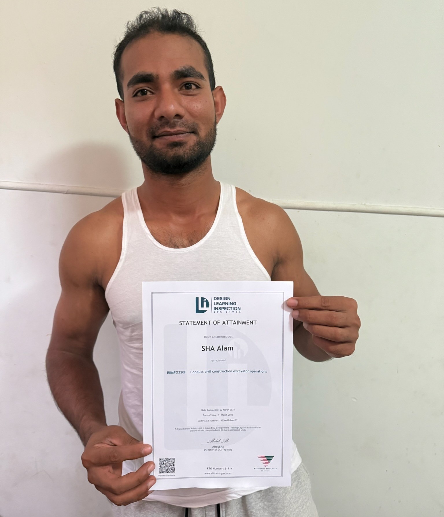Image: Sha is wearing a white singlet and grey pants. He is holding up a certificate in 'Conduct civil construction excavator operations'.