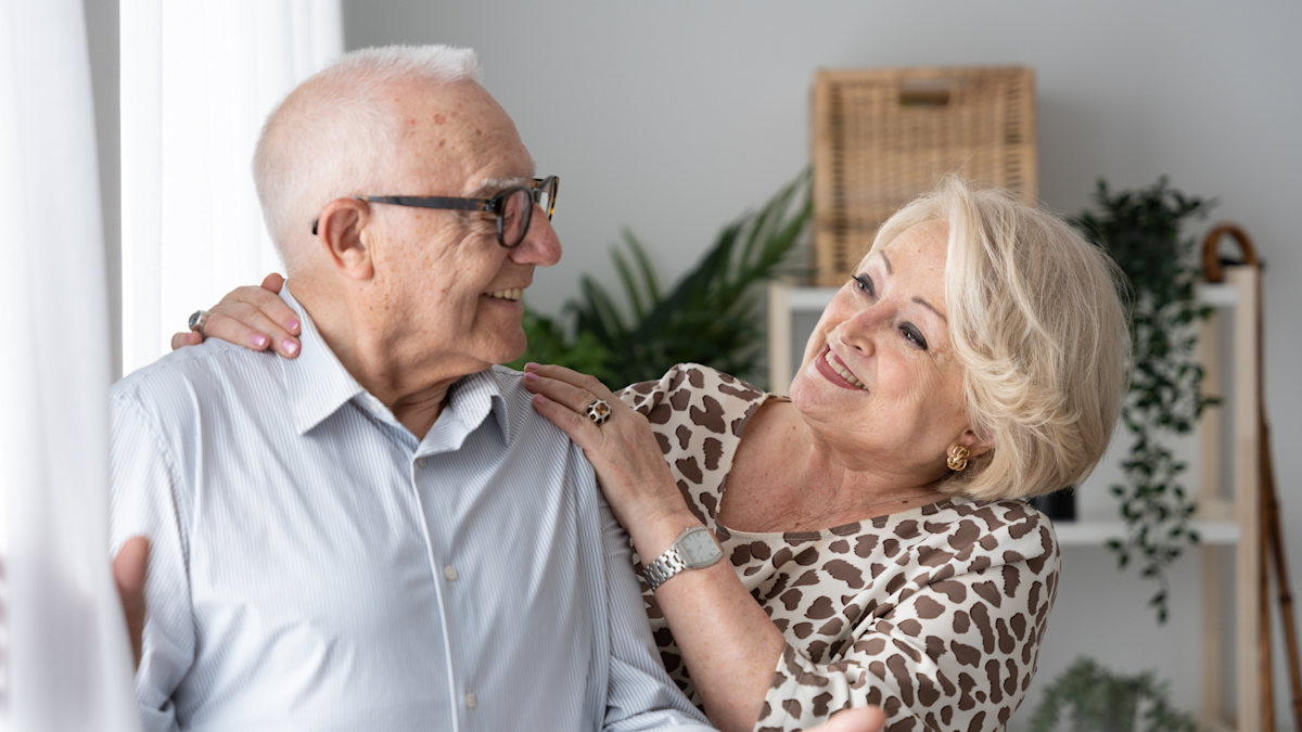 Image: An elderly couple stand side by side, smiling at each other.