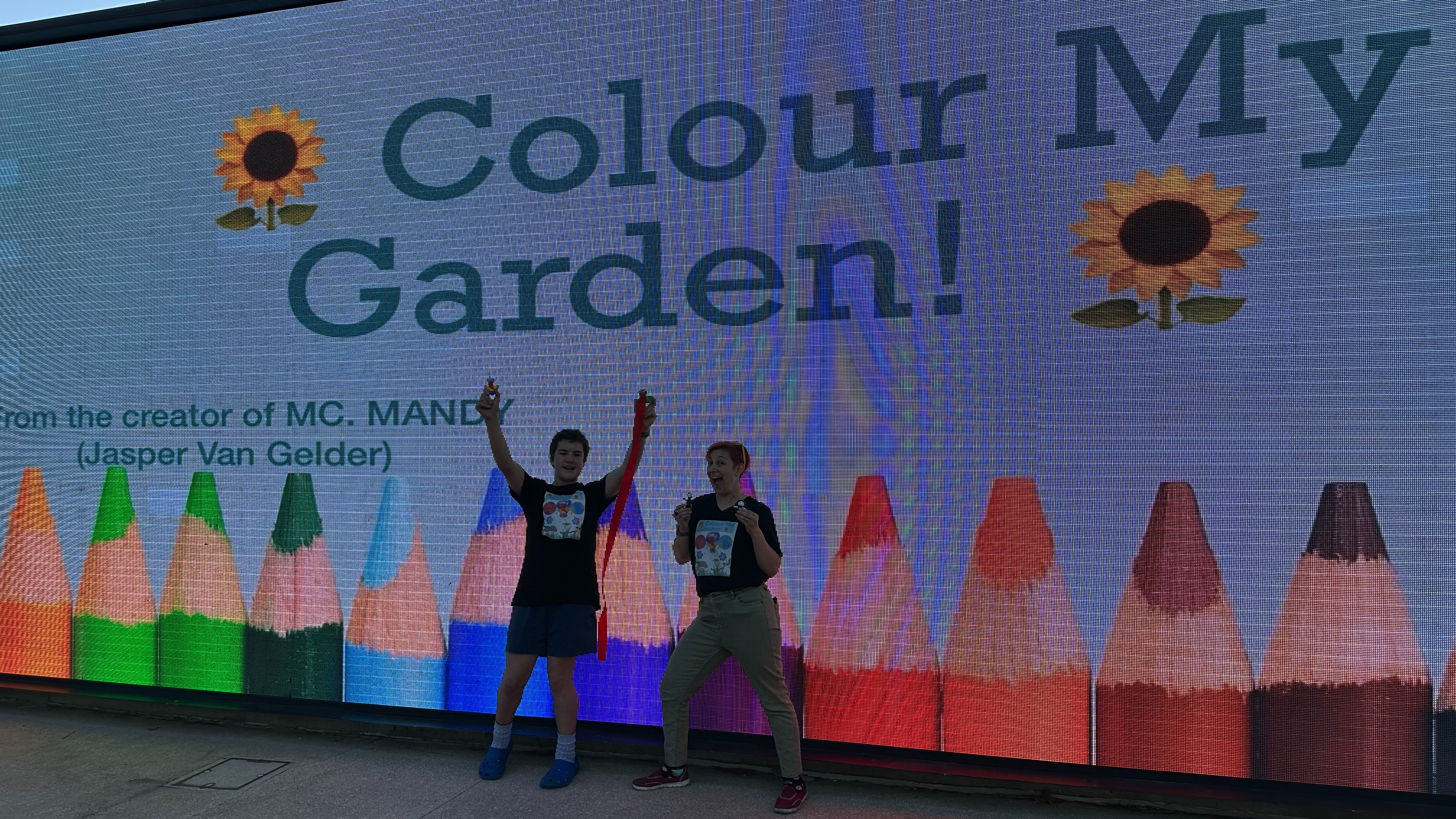 Image: Jasper and Phi standing infront of a large outdoor screen displaying 'Colour My Garden'.