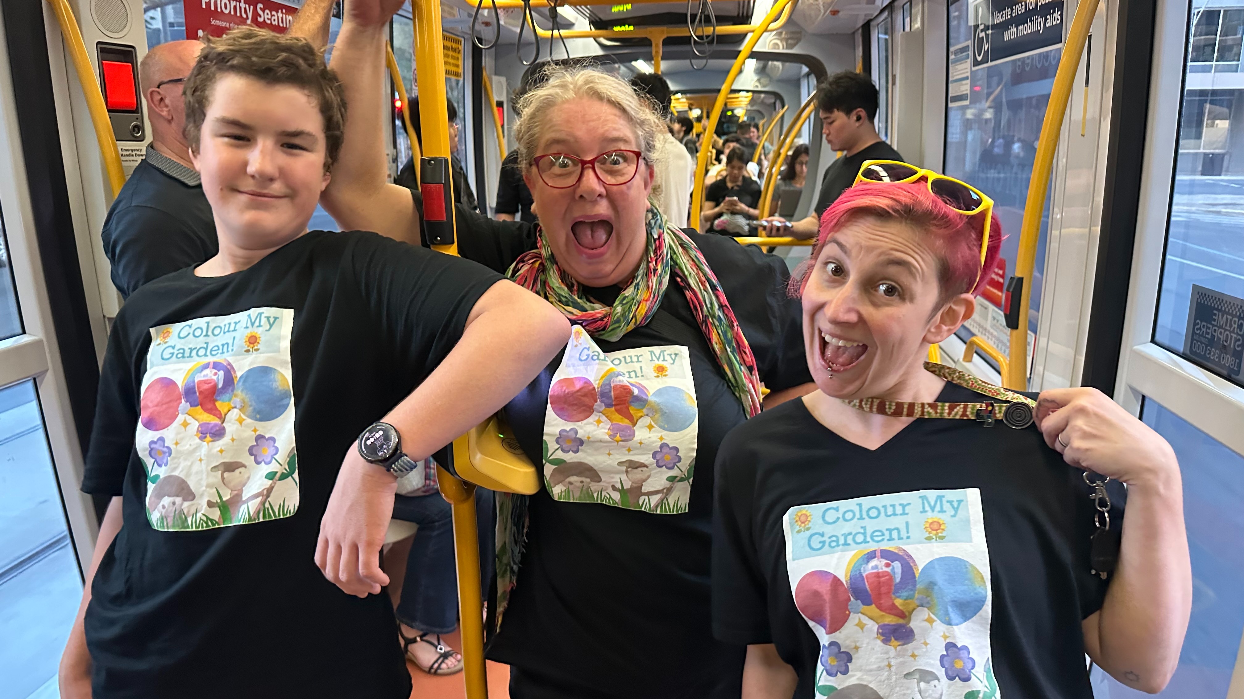 Image: Jasper, Verity and Phi wearing 'Colour My Garden' t-shirts, standing on a train.