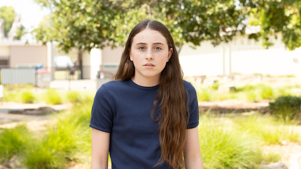 Image: A teenage girl with long brown hair, wearing a blue t-shirt, stands outdoors, looking at the camera.