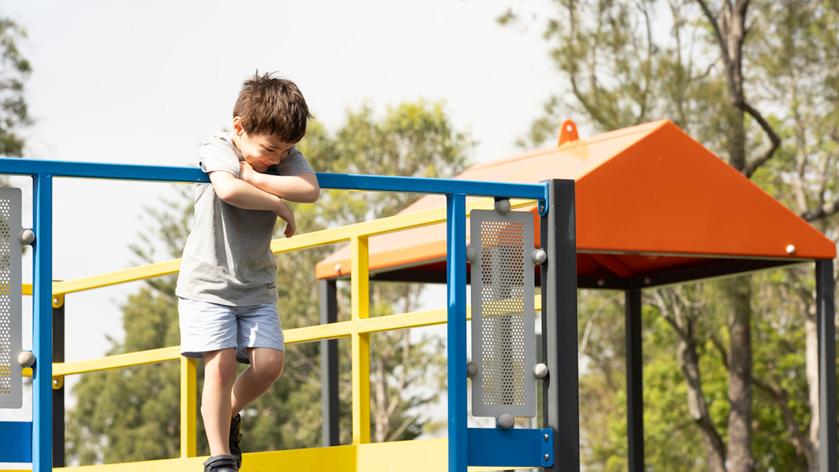 Image: A child stand at the top of a playground, looking down.