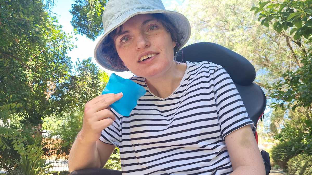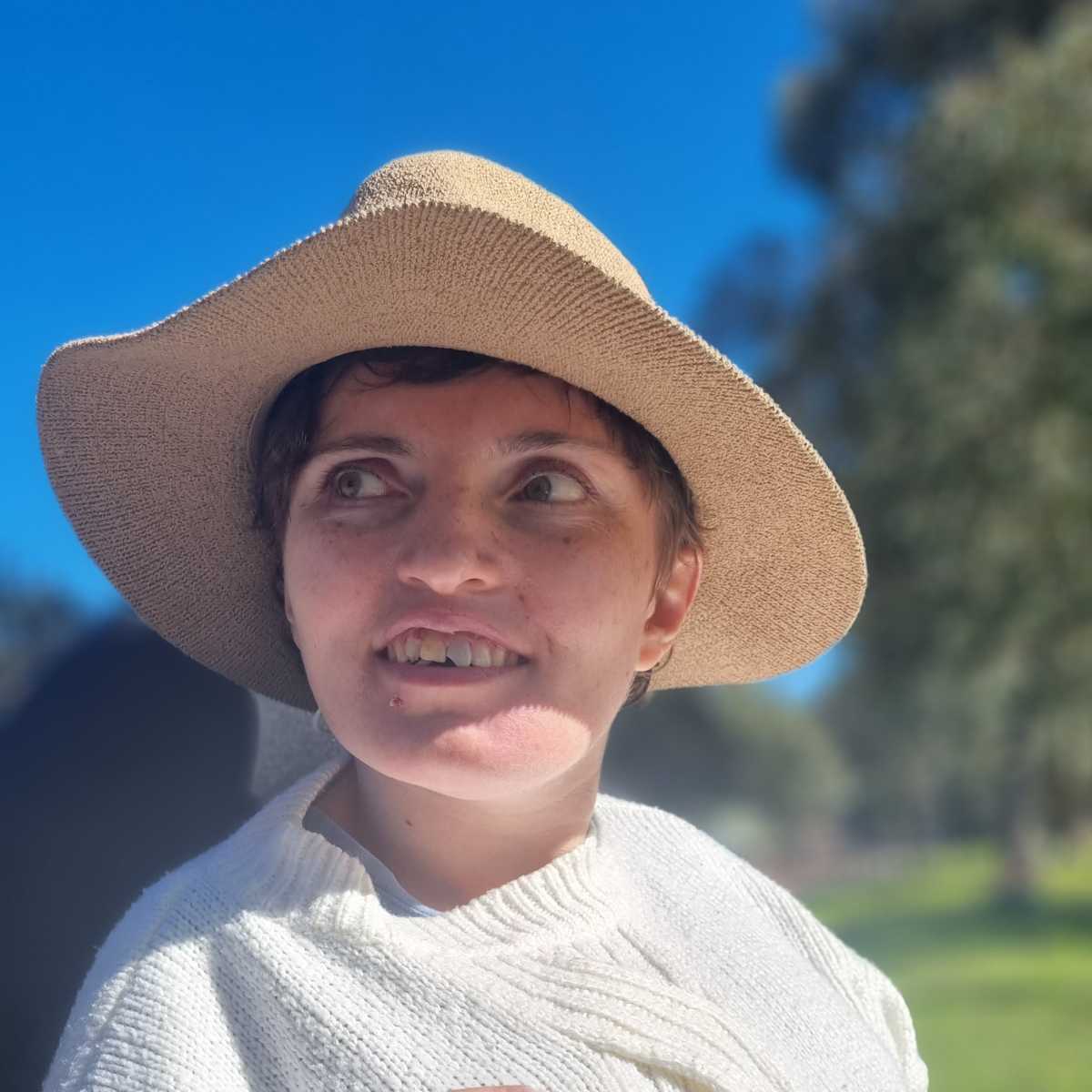 Image: Kelsey sitting outdoors, wearing a hat and a white jumper.