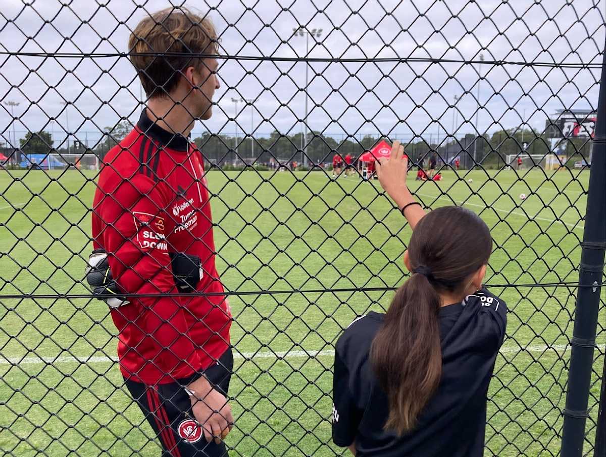 Image: A young person with their back to the camera talks to a player through a fence at a training session.
