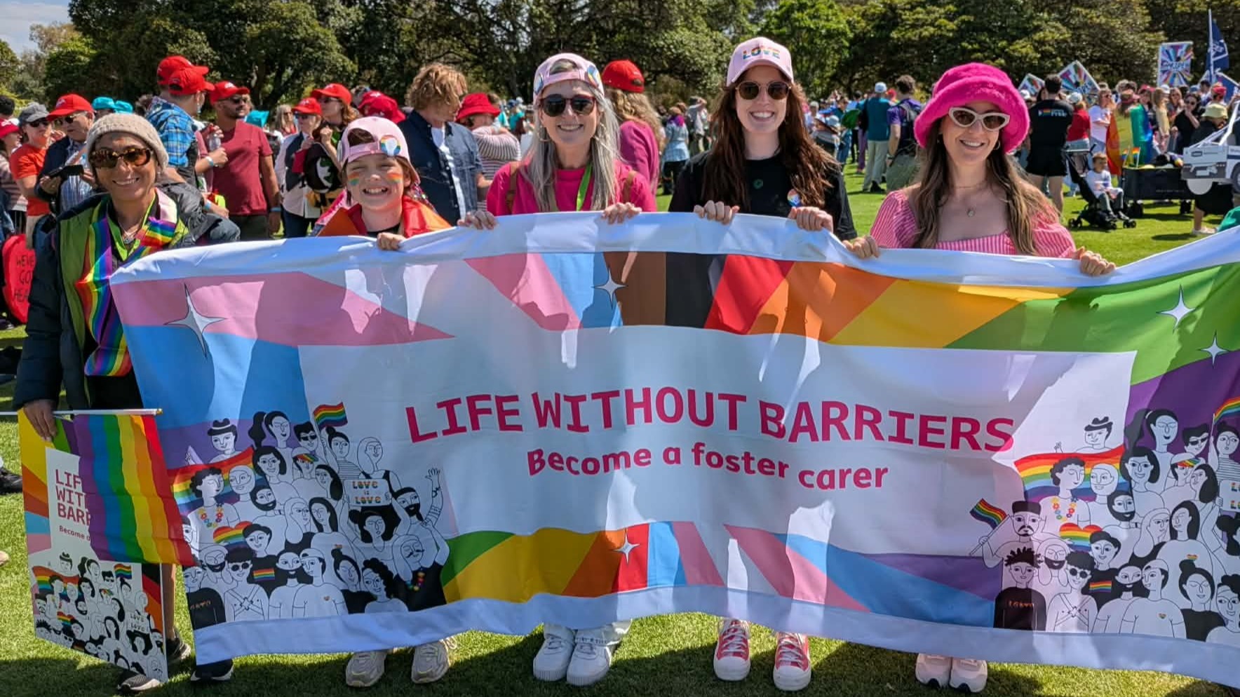 Image: Life Without Barriers staff, foster carers and their family members holding up a Life Without Barriers 'Become a foster carer' banner at the Midsumma Pride March.