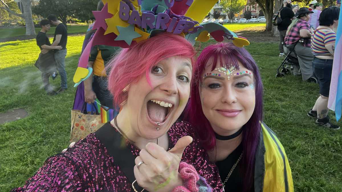Image: Phi and Louise, wearing brightly coloured clothing and glittery make up, take a selfie at the Adelaide Pride March.
