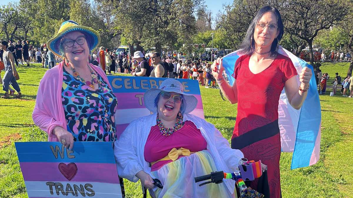 Image: Ariel holds up the Trans Pride flag whilst taking part in the Adelaide Pride March.