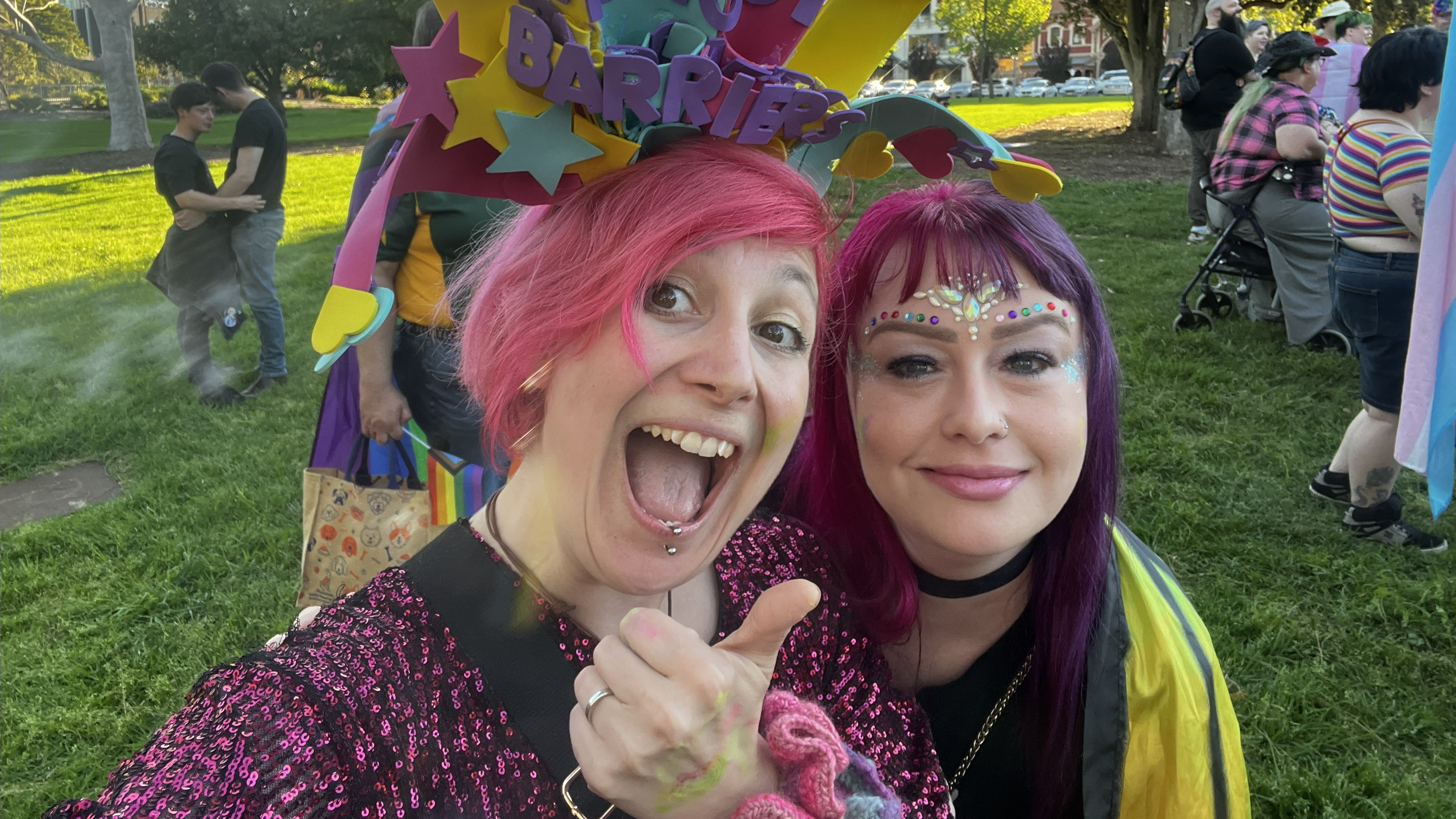 Image: Phi and Louise, wearing brightly coloured clothing and glittery make up, take a selfie at the Adelaide Pride March.