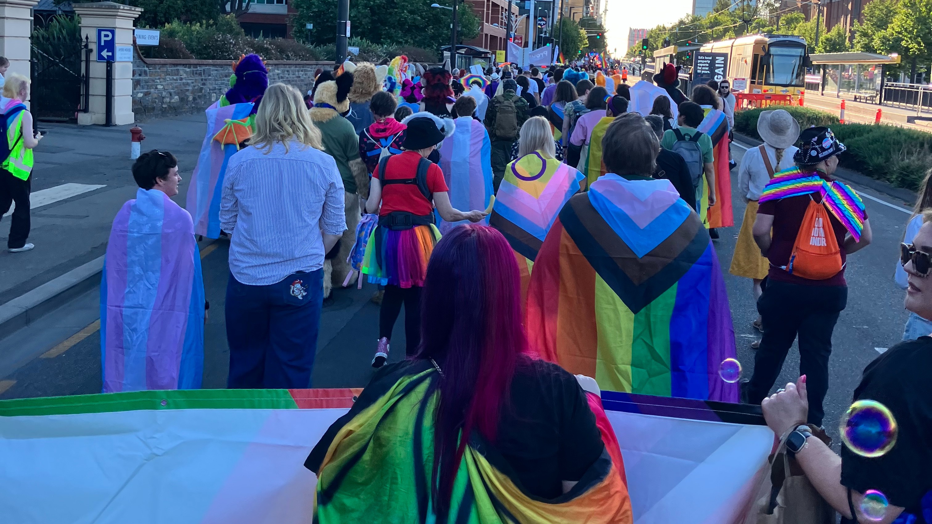 Image: Individuals wearing rainbow pride flags, taking part in the Adelaide Pride March.